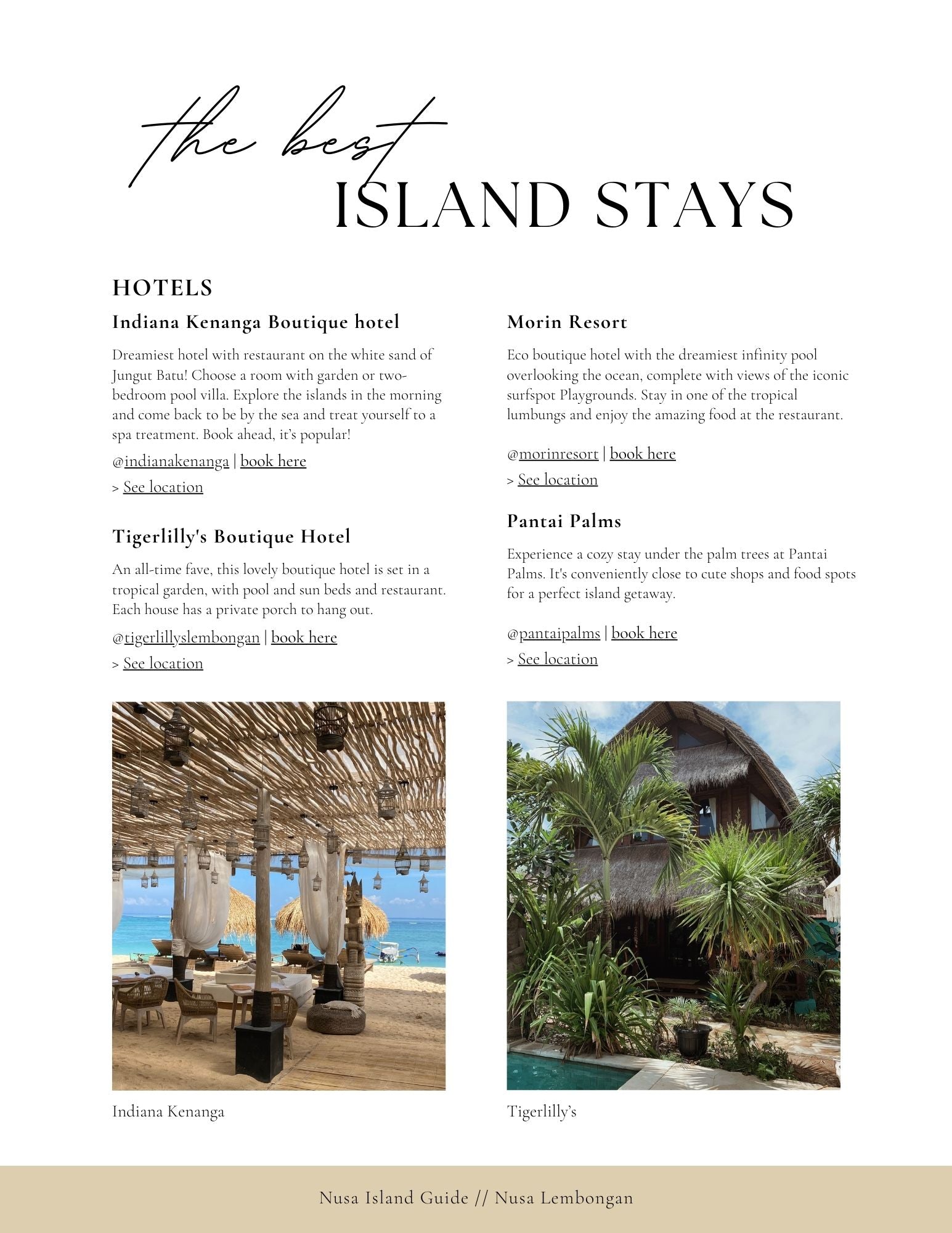 Inside, you'll find our top picks of (secret) beaches, surf spots, ocean-view cafes, stays (from low budget homestays and tropical bungalows to private pool villas and beach front boutique hotels!), best spas and the most stunning sights you can't miss out on. Including all our contacts for everything you'll need to arrange, from boat tickets to transport and snorkel tours to surf classes. PLUS: we linked them all to directly book or navigate! We did all the work for you so you can explore effortlessly and create unforgettable memories with all our insider tips right in your pocket!